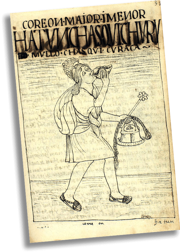 El chaski siempre viajaba con una trompeta de caracol, para anunciar su llegada y alertar a su relevo; La información la llevaba en un quipu.